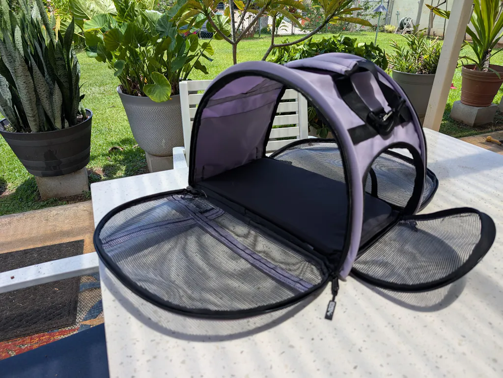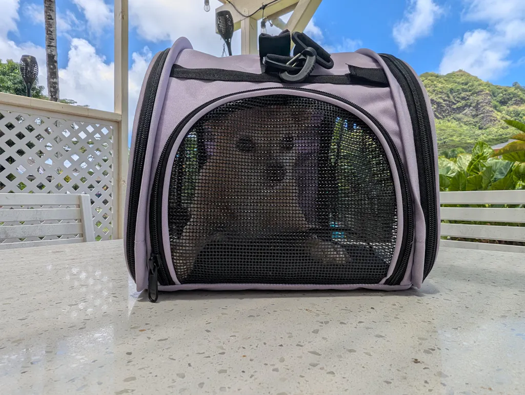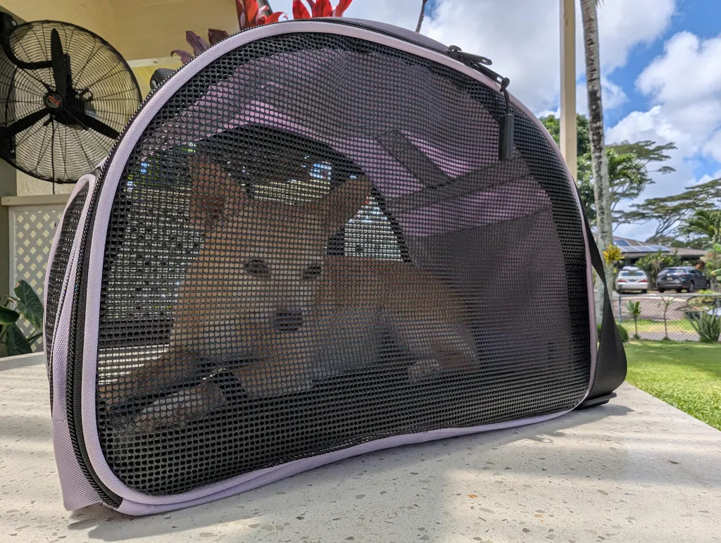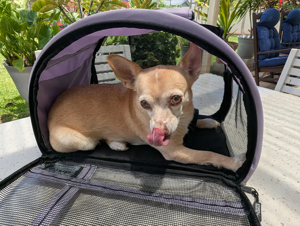 I recently relocated and had my two dogs in the airplane cabin with me for the six hour flight to Hawaii. Elsie has flown a few times, but this was her longest flight by far. She wasn't enjoying the limited visibility and low height of her previous carrier, so I was happy to find the Totes'ter had full mesh sides and taller arched top.